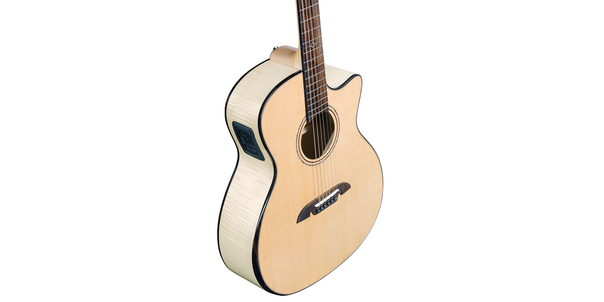 The AGFM80CEAR is a beautifully developed Grand Auditorium that delivers in terms of both of tone and looks. The minimal styling of this guitar really creates a classy vibe with the light blonde of the spruce and maple framed with Ebony. Tonally this guitar has a robust voice, with shimmering trebles and plenty of low end and an instant response. It also offers added functionality and comfort with its cutaway and slim style bevel armrest, making the AGFM80CEAR a great looking, versatile instrument.
