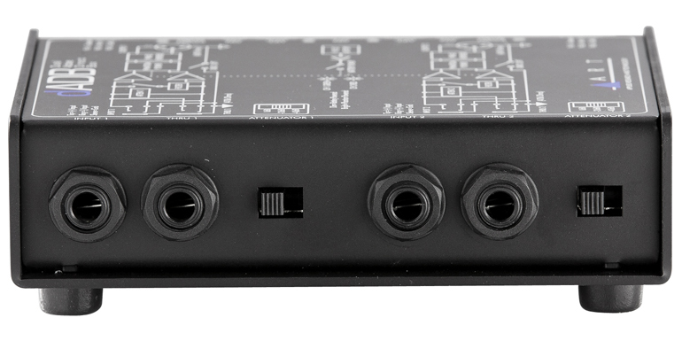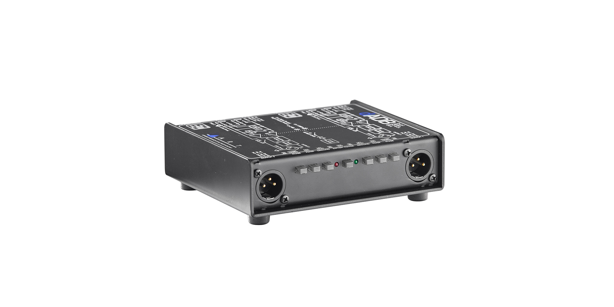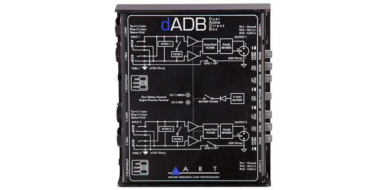 The ART dADB dual active direct box acts as two independent, high quality active interfaces for connecting instrument, line, or speaker level signals to balanced inputs. The high impedance ¼-inch inputs are buffered and converted by extremely low noise active electronics to deliver isolated, balanced, low impedance outputs.The dADB delivers an extremely flat and wide frequency response even at high input levels, making it a virtually acoustically transparent DI solution.Input attenuation on each channel allows for a wide range of source signal levels. Independent parallel thru jacks allow for tapping the signal chains. A Ground Lift on each channel allows for totally separate the input and output signal grounds to isolate two systems when required, thus reducing hum and ground-loop noise.Switchable low pass Bessel filters eliminate high frequency interference. Operating outside of the audio range these complex and effective filter circuits are primarily intended to eliminate radio frequency interference before it gets into the main system. They also effectively reduce digital computer noise making the dADB the ideal DI solution for laptops, computer workstations and peripherals when used in stereo PA applications.The dADB's active circuitry is powered by phantom power or by an internal 9V battery when external power is not available. Low current draw (less than 7.5 mA) should provide more than 100 hours of operation with a new battery (alkaline recommended).The compact black all steel case and active design ensure unmatched long-term reliability in Live Sound, Permanent/Fixed Install, D.J., or virtually any PA application.