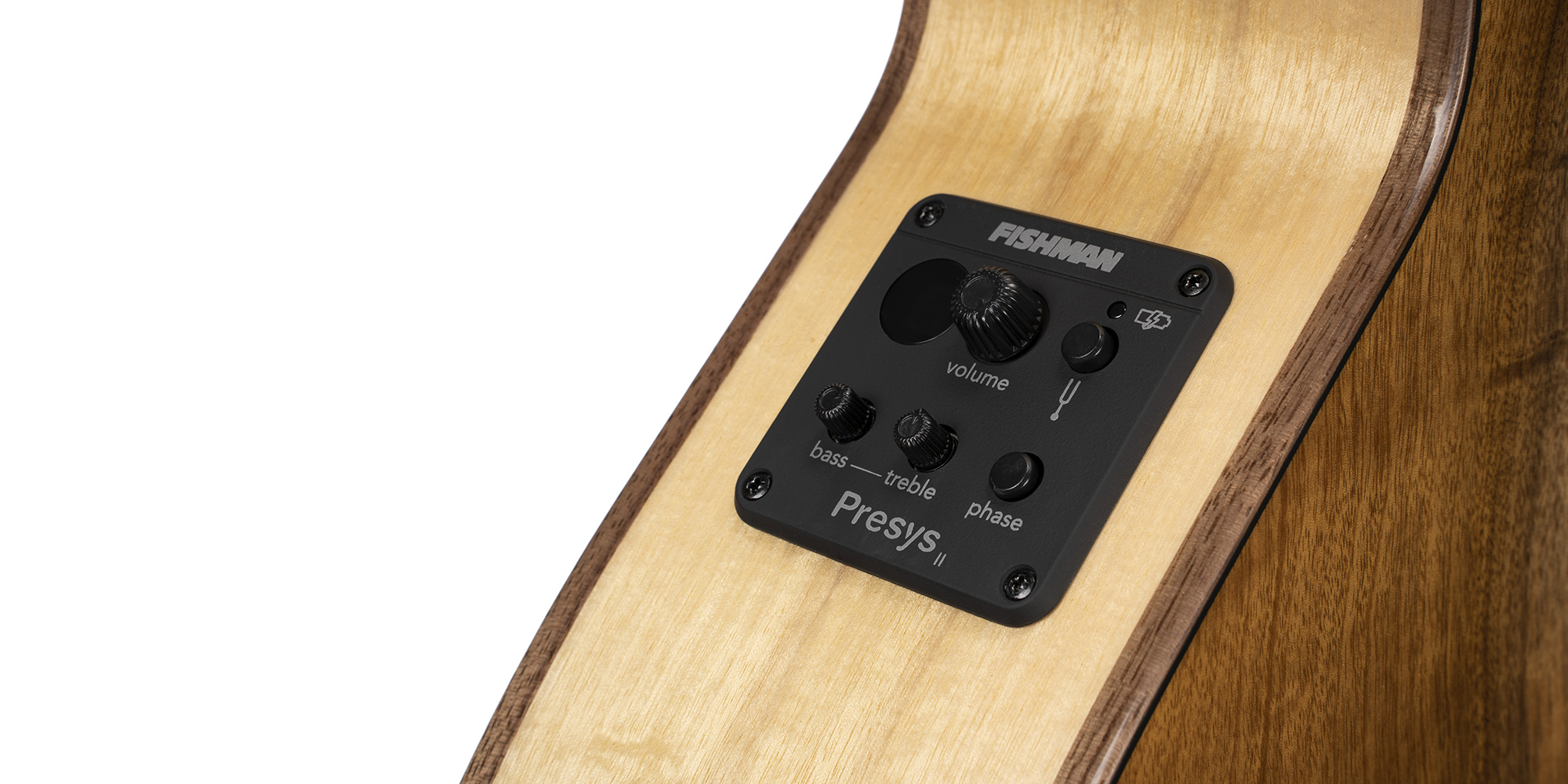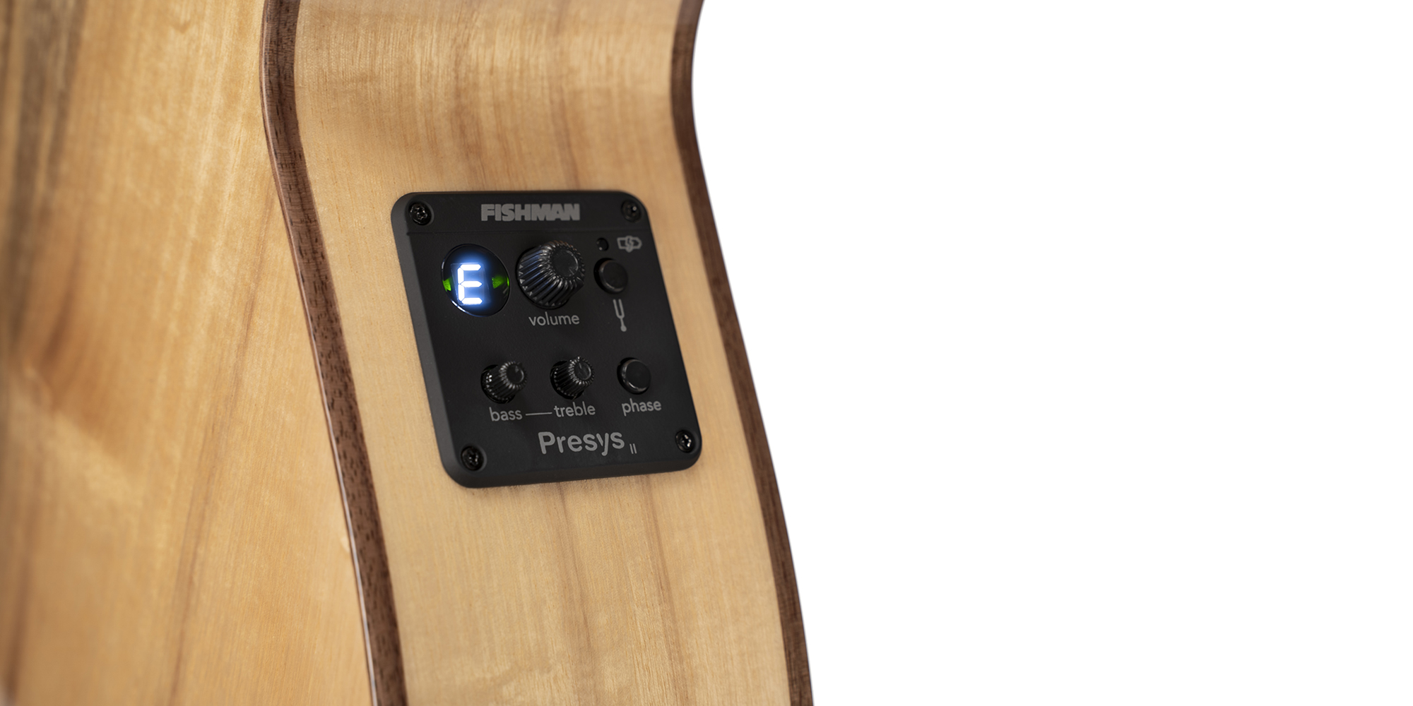 The Fishman® Presys II Preamp with 2-band equalization, builtin tuner and a Phase switch for effective tone shaping and noiseless operation during live performances.