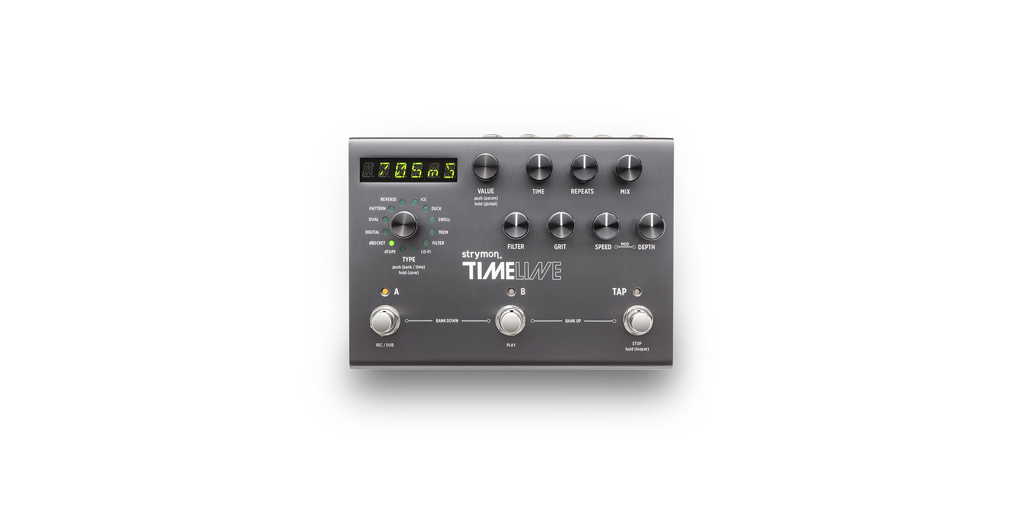 • Seven front-panel tone shaping knobs: Time, Repeats, Mix, Filter, Grit, Mod Speed, Mod Depth