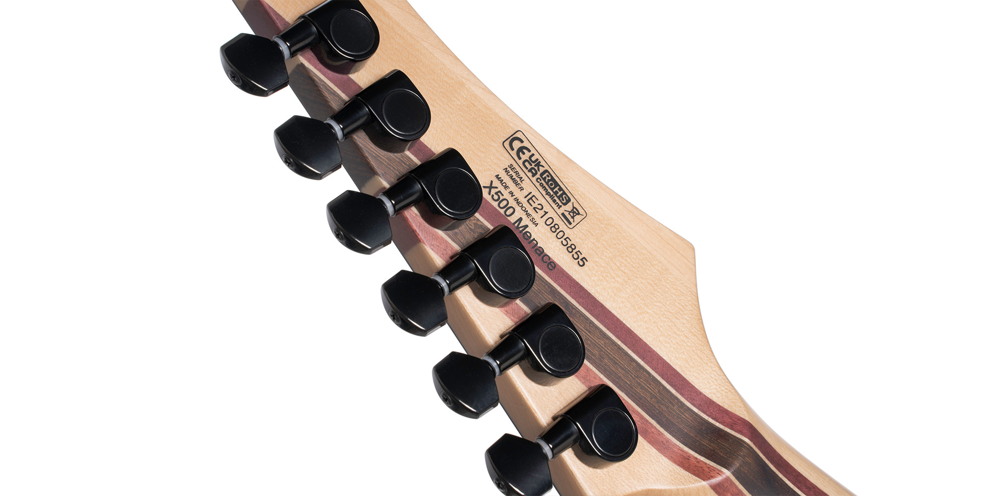 X500 is born again with a modern aesthetic and feature upgrades to become the new darker and aggressive X500 Menace, making it highly suitable for metal and extreme music guitarists. While maintaining the neck-thru-body construction for exceptional sustain and high frets access, the X500 Menace now features a more popular maple top on mahogany body combination, reverse headstock, 7-piece Maple / Purple Heart / Panga Panga neck and compound radius fingerboard, FloydRose® 1000 Series tremolo, and Seymour Duncan® Sentient & Nazgul Humbucker set for superb playability, sound quality, and that menacing presence the guitarists for extreme genre seek.
