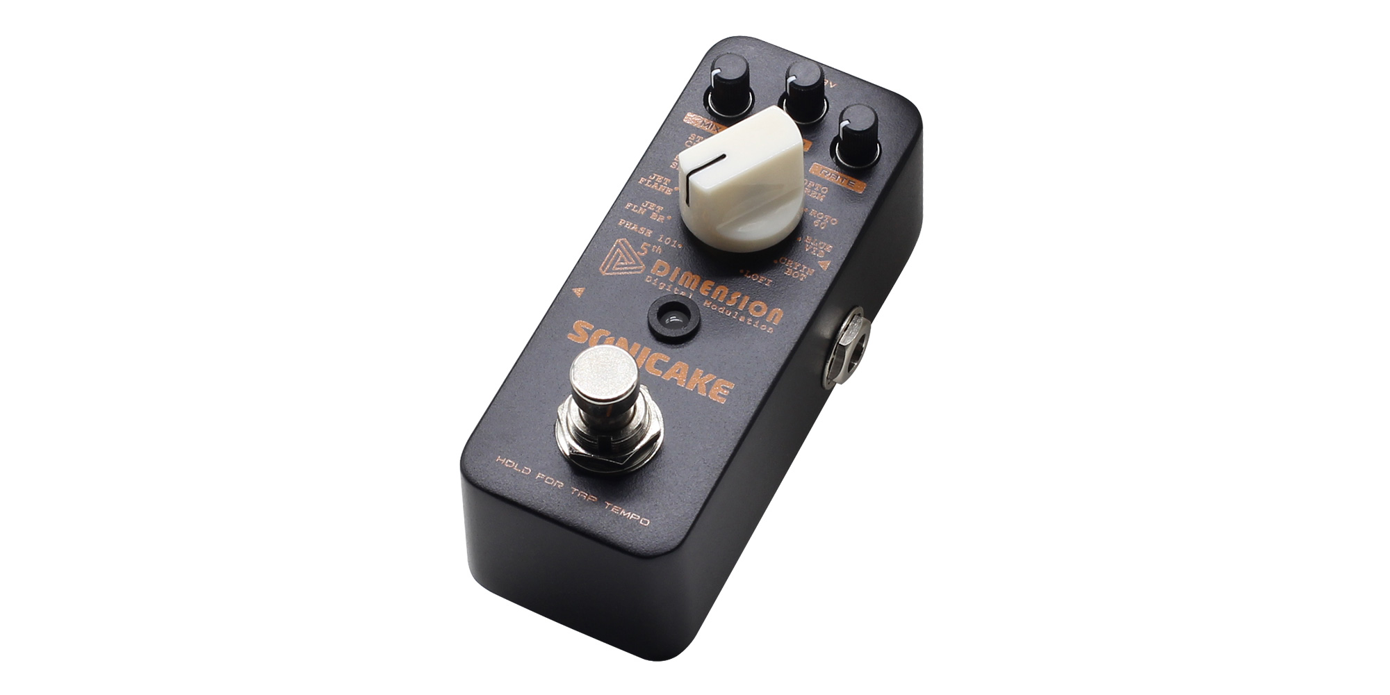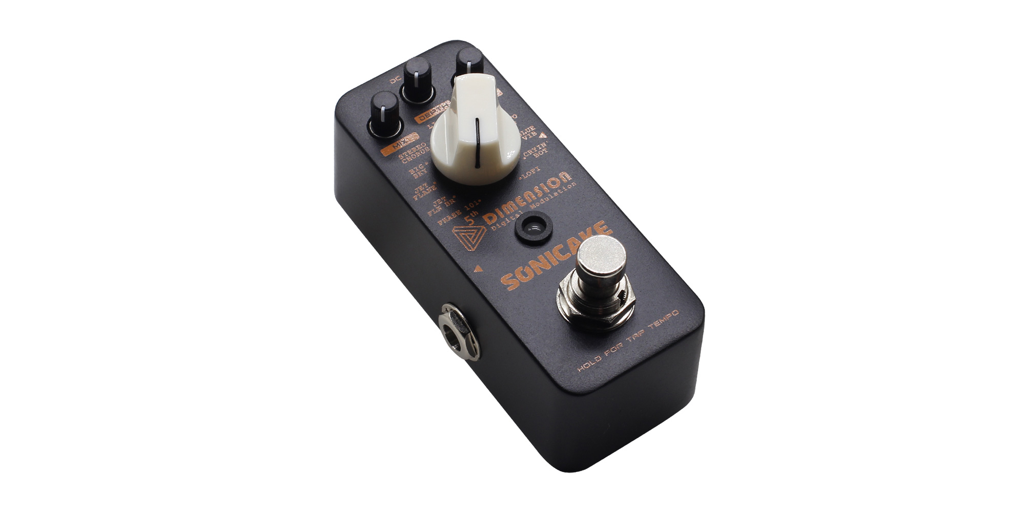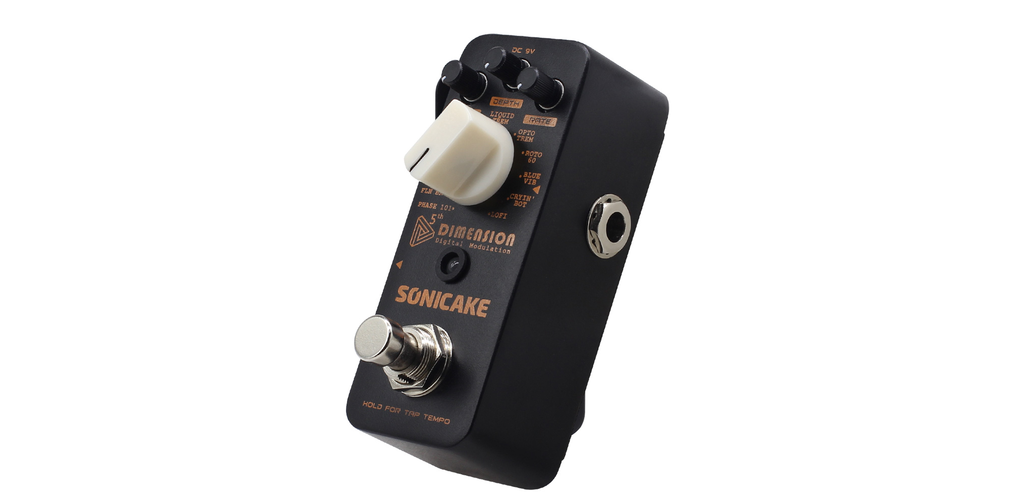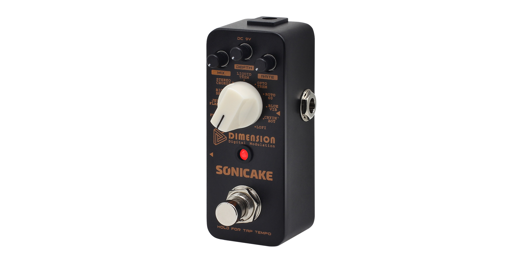 Sonicake 5th Dimension è un insieme degli 11 effetti di modulazione digitali più comunemente richiesti, che aggiungono molteplici dimensioni sonore al vostro timbro, offrendo maggiori possibilità al vostro palato tonale. L'utilizzo è più che semplice, con una manopola MIX che controlla il livello degli effetti, una manopola DEPTH che regola la profondità degli effetti, una manopola RATE che regola la velocità degli effetti e un selettore MODE che permette di scegliere tra questi 11 effetti. Per le mie orecchie, questi 11 effetti suonano tutti come un affare serio. I toni parlano da soli!