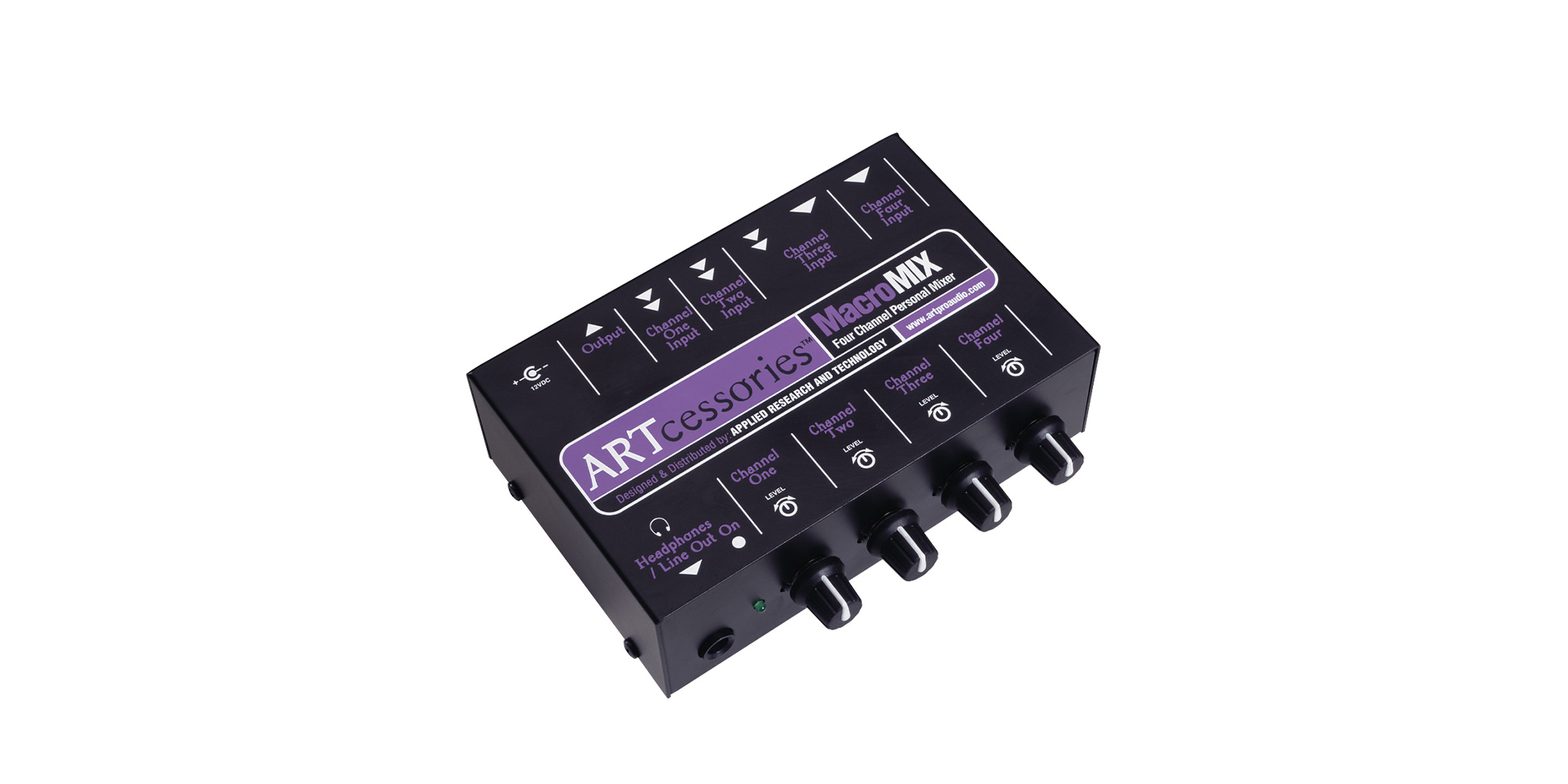 Il MacroMIX è un mixer da quattro canali di linea, ciascuno dotato di un controllo di volume indipendente. Questa unità dispone di due ingressi jack 1/4″, tre set di ingressi RCA stereo (che vengono mixati in mono) e un abbondante guadagno per il vostro amplificatore di potenza. La sezione d'uscita offre due uscite mono RCA e un'uscita jack 1/4″. Il MacroMIX è alimentato da un alimentatore esterno da 12V DC.