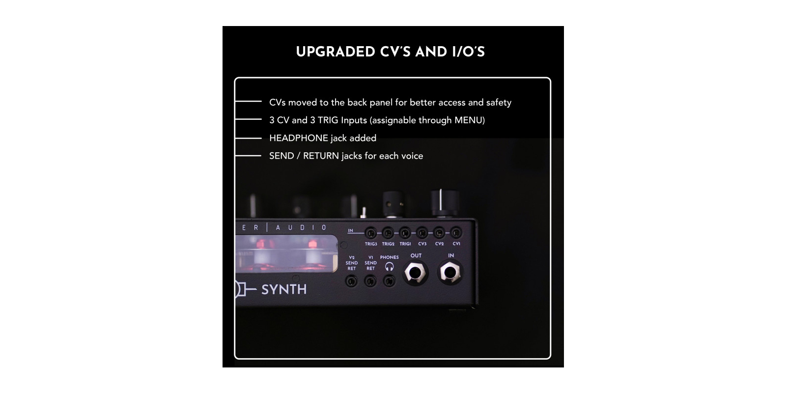 ·due prese SEND/RETURN separate (TRS da 3,5 mm) per ogni voce MOTOR (pre-VCF, post-VCA)
