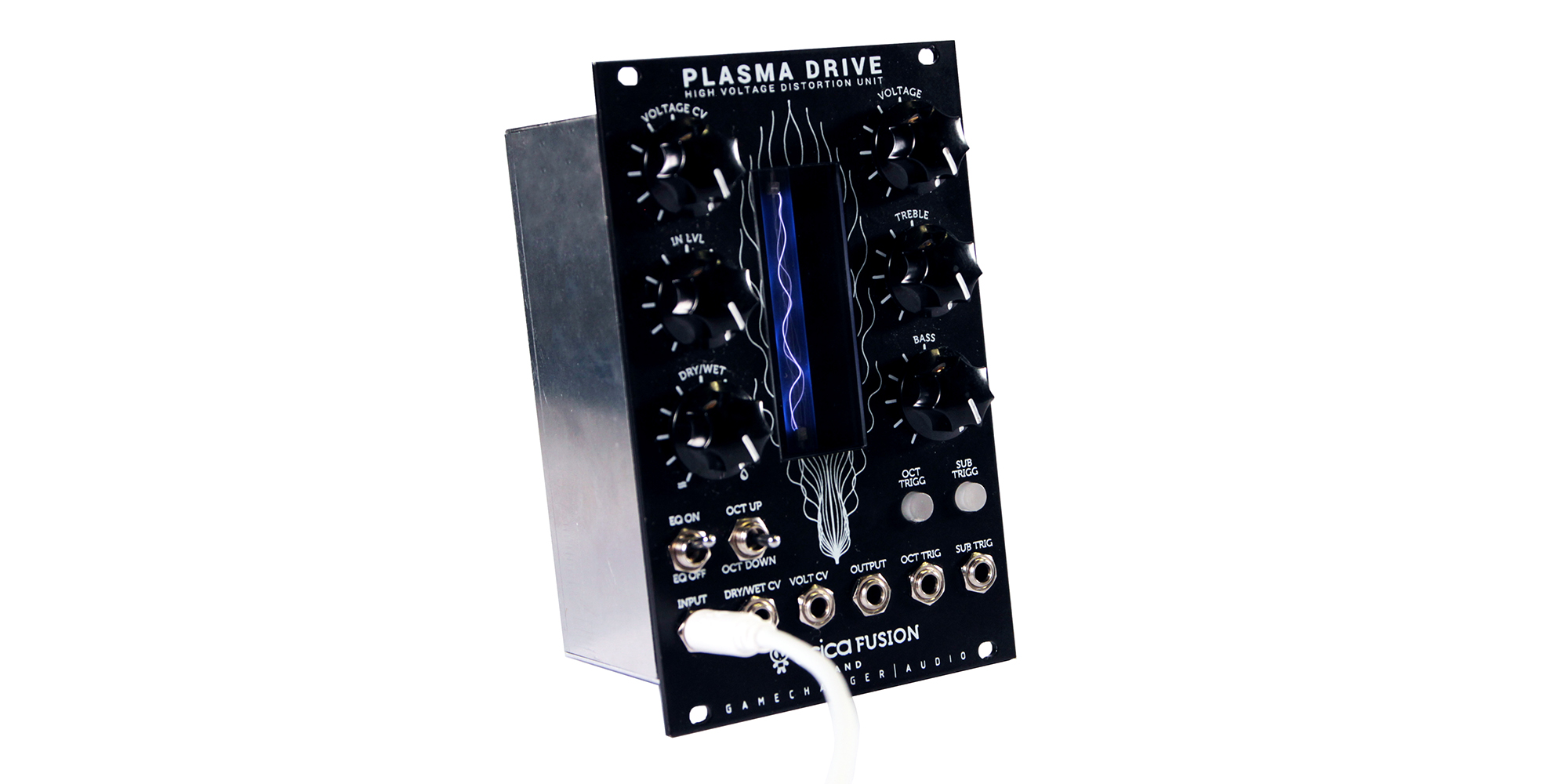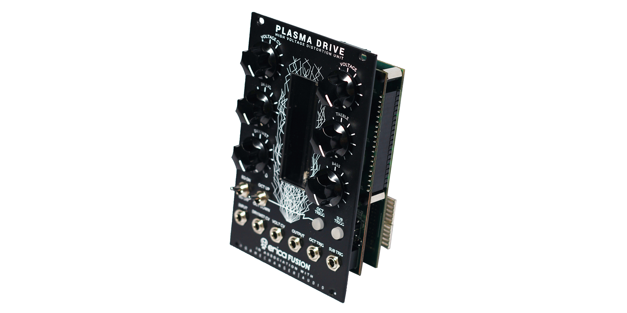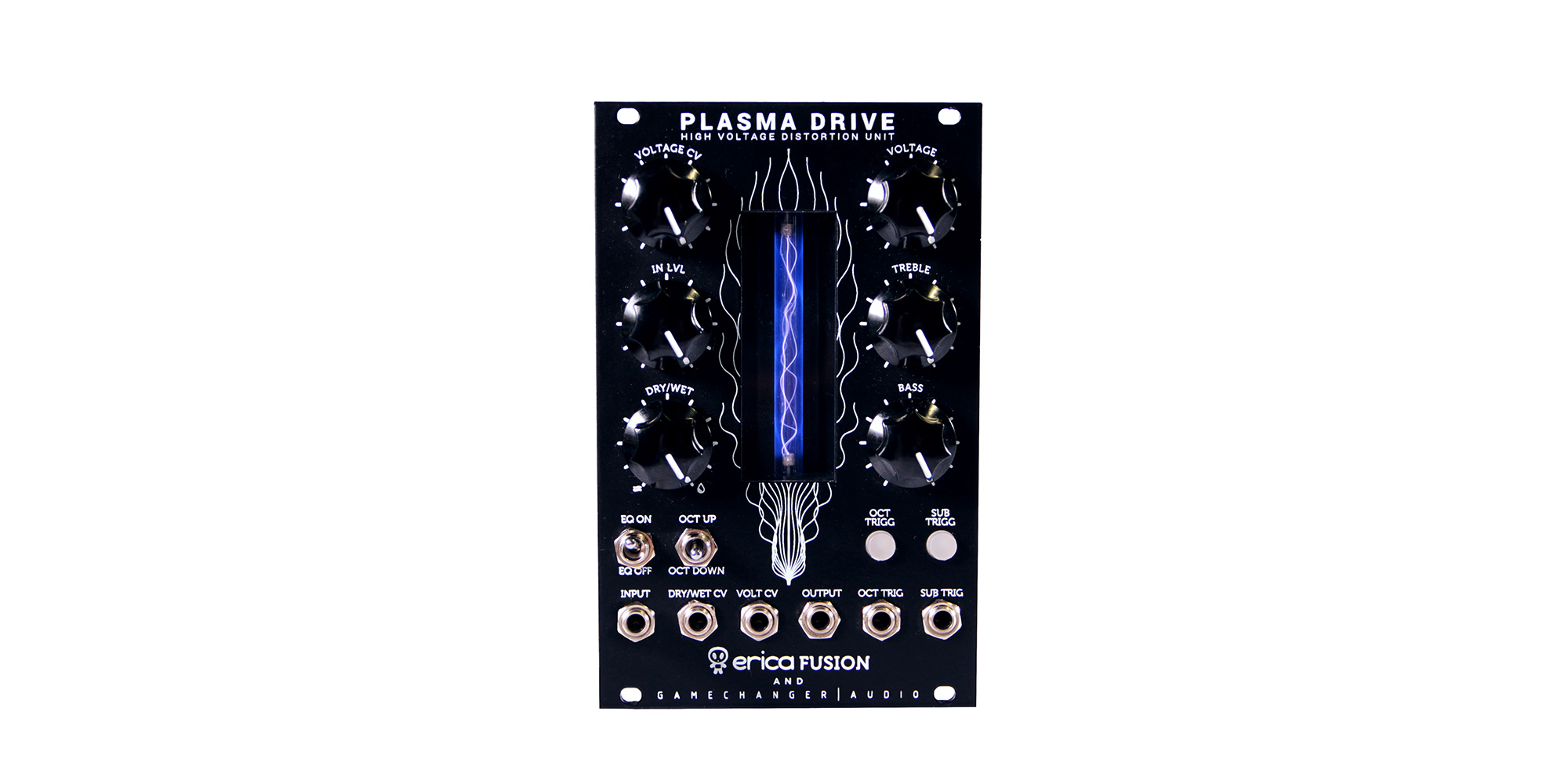 Le funzioni che si trovano sul Plasma Pedal sono qui integrate con un controllo CV sul livello di distorsione, e per il bilanciamento dry / wet del mix. Il modulo introduce degli oscillatori per una nuova funzione Octave Up & Two-Octave Down, aggiungendo così ancora più armoniche al segnale originale. Gli oscillatori possono essere attivati / disattivati manualmente o tramite segnali di trigger. Il modulo Plasma Drive è alimentato con cavo a nastro PSU eurorack standard, e l’assorbimento è di circa 250 mA.