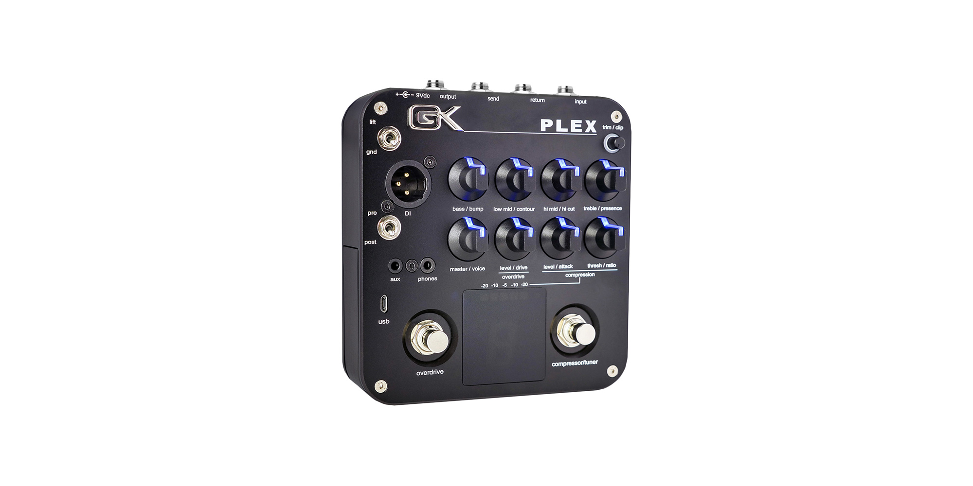 Il preamplificatore Plex combina 47 anni di esperienza nella progettazione di amplificatori con una tecnologia all'avanguardia per offrire la flessibilità richiesta dai musicisti di oggi. Il cuore di ogni prodotto GK è l'equalizzatore attivo a 4 bande a “Q variabile” ed il circuito di contour che ha stabilito lo standard per la modellazione del tono del basso oltre 30 anni fa. Partendo da questa base collaudata, il PLEX offre opzioni di filtro ampliate che consentono di comporre ulteriormente la voce unica del vostro strumento. Il compressore e l'overdrive attivabili con un footswitch dedicato ciascuno, assicurano che la vostra performance si integri perfettamente con la band o che si distingua in un mix affollato, mentre l'accordatore cromatico assicura che tutto sia intonato. L'uscita da ¼” può pilotare il vostro amplificatore o il vostro finale di potenza, mentre l'uscita DI invia il tutto al PA o alla console di registrazione. L'ingresso Aux IN e l'uscita Phones Out rendono il PLEX ideale per suonare in silenzio i vostri brani preferiti, mentre l'ingresso/uscita USB consente la registrazione digitale e il re-amping con il vostro software di registrazione preferito.