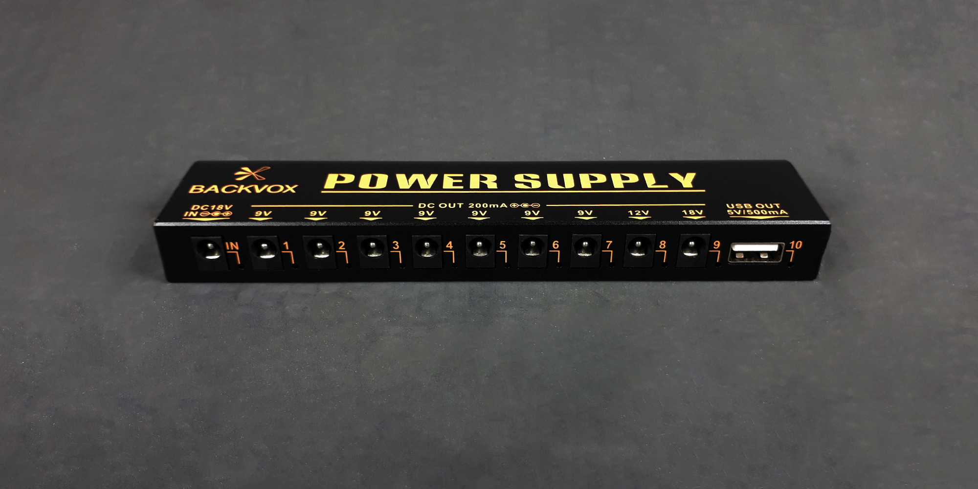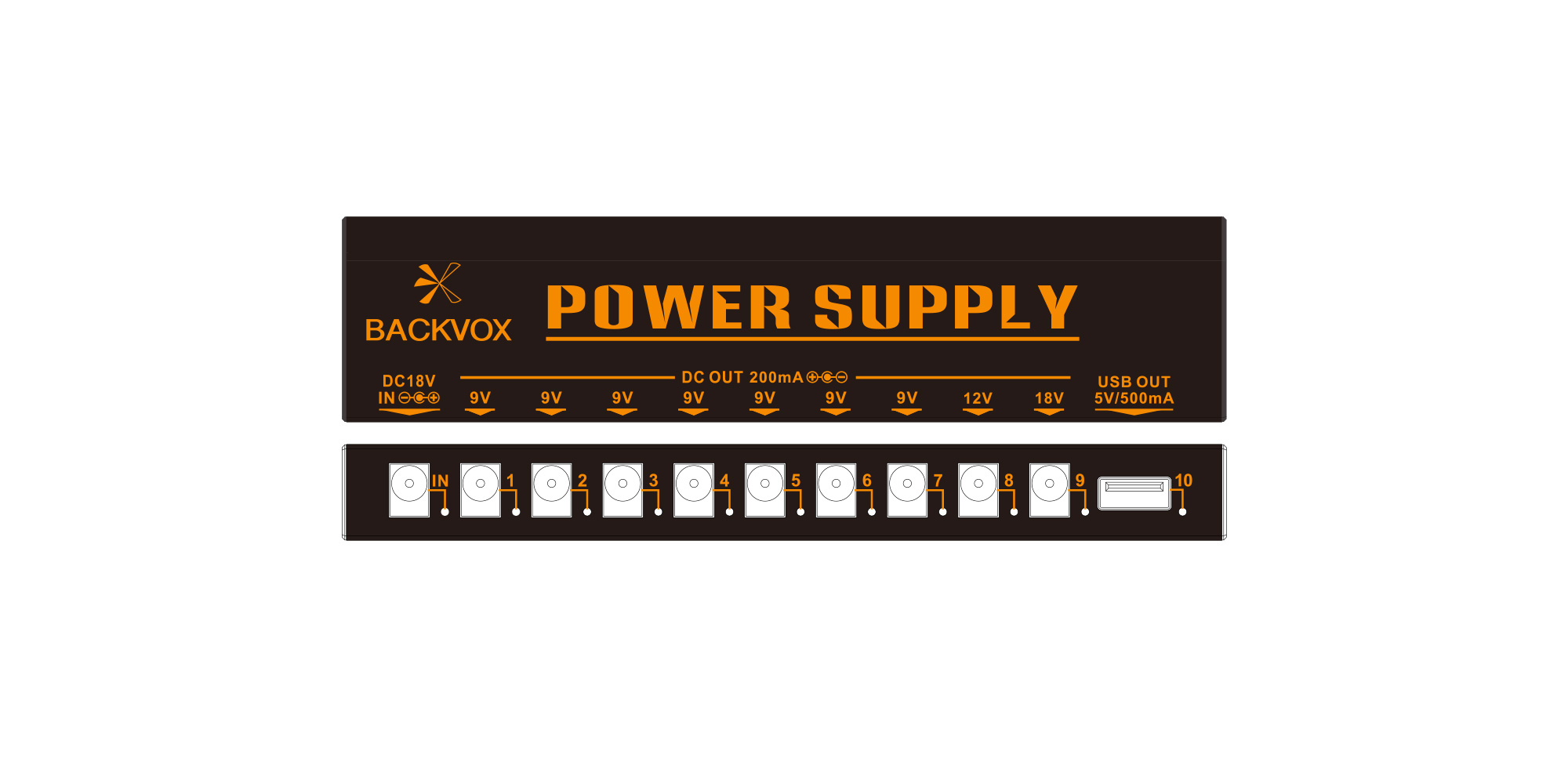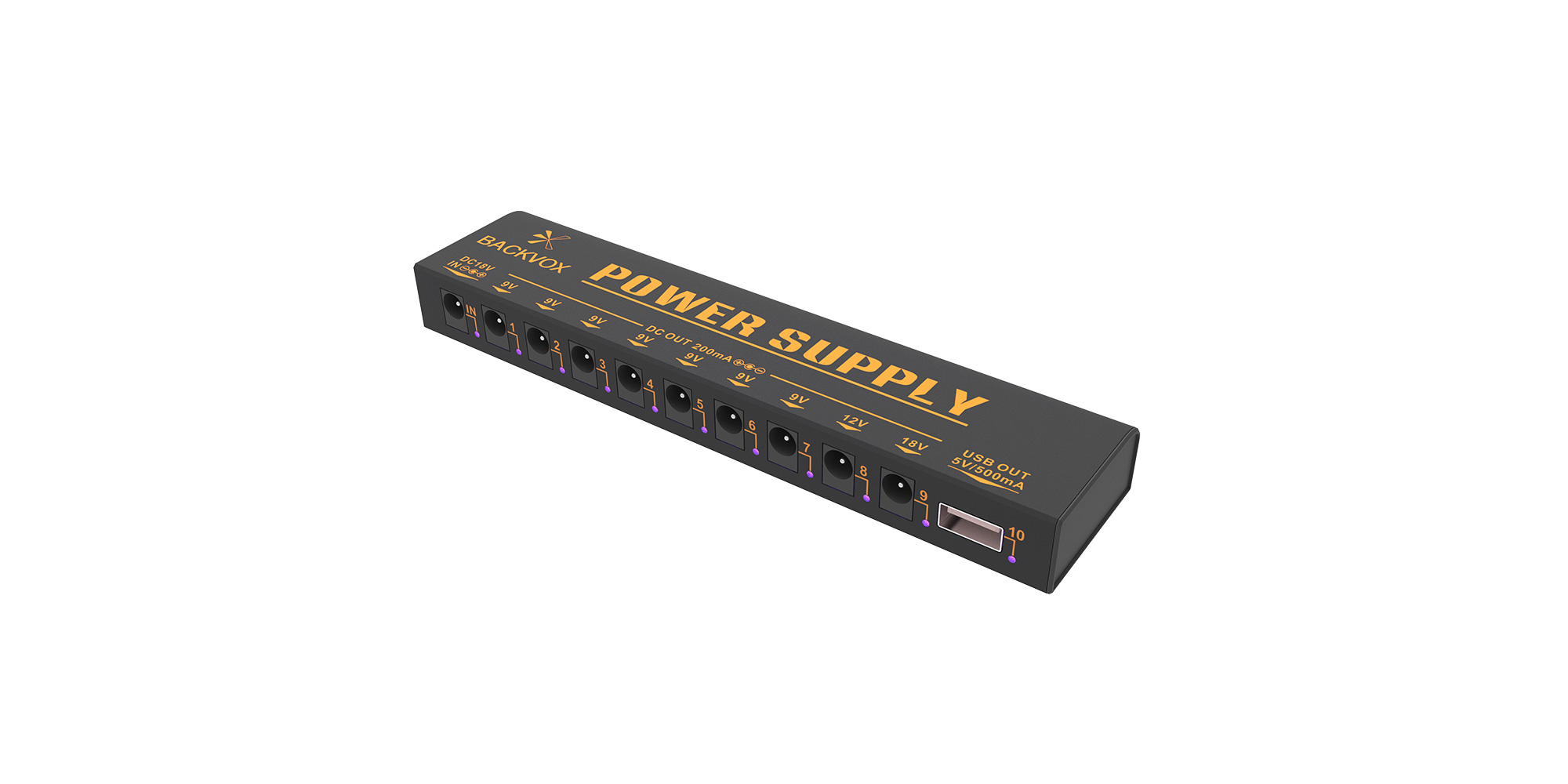 Il Backvox PS-04 è un alimentatore appositamente progettato per alimentare gli effetti a pedale, dotato di nove uscite isolate da 200mA, sette da 9V, una da 12V ed una da 18V. È stato pensato per soddisfare tutte le esigenze di alimentazione del musicista moderno, liberandolo da problemi comuni quali il rumore di fondo, lasciandolo libero di godere appieno di un'esperienza musicale pura. Silenzioso, leggero ed efficiente, è inoltre dotato di una comoda uscita USB da 5V per poter alimentare smartphone e tablet. Dotato di cavetti per il collegamento agli effetti e velcro biadesivo.