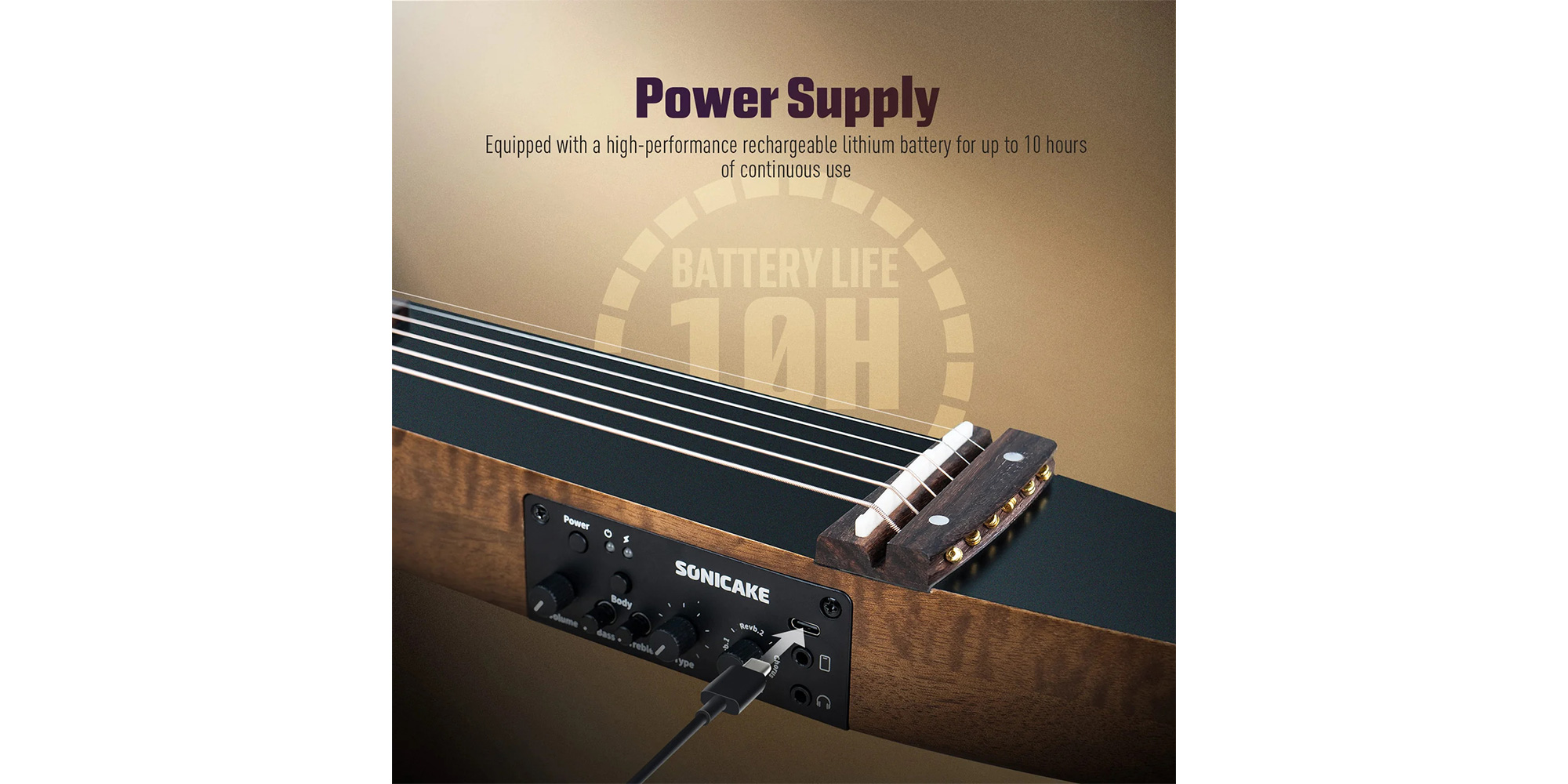 • Advanced Digital Preamp: Sonicake’s self-developed system offers multiple body-shape simulations, high-quality reverb and chorus, resonance enhancement, and a 2-band EQ, delivering a warm, balanced, and versatile tone.