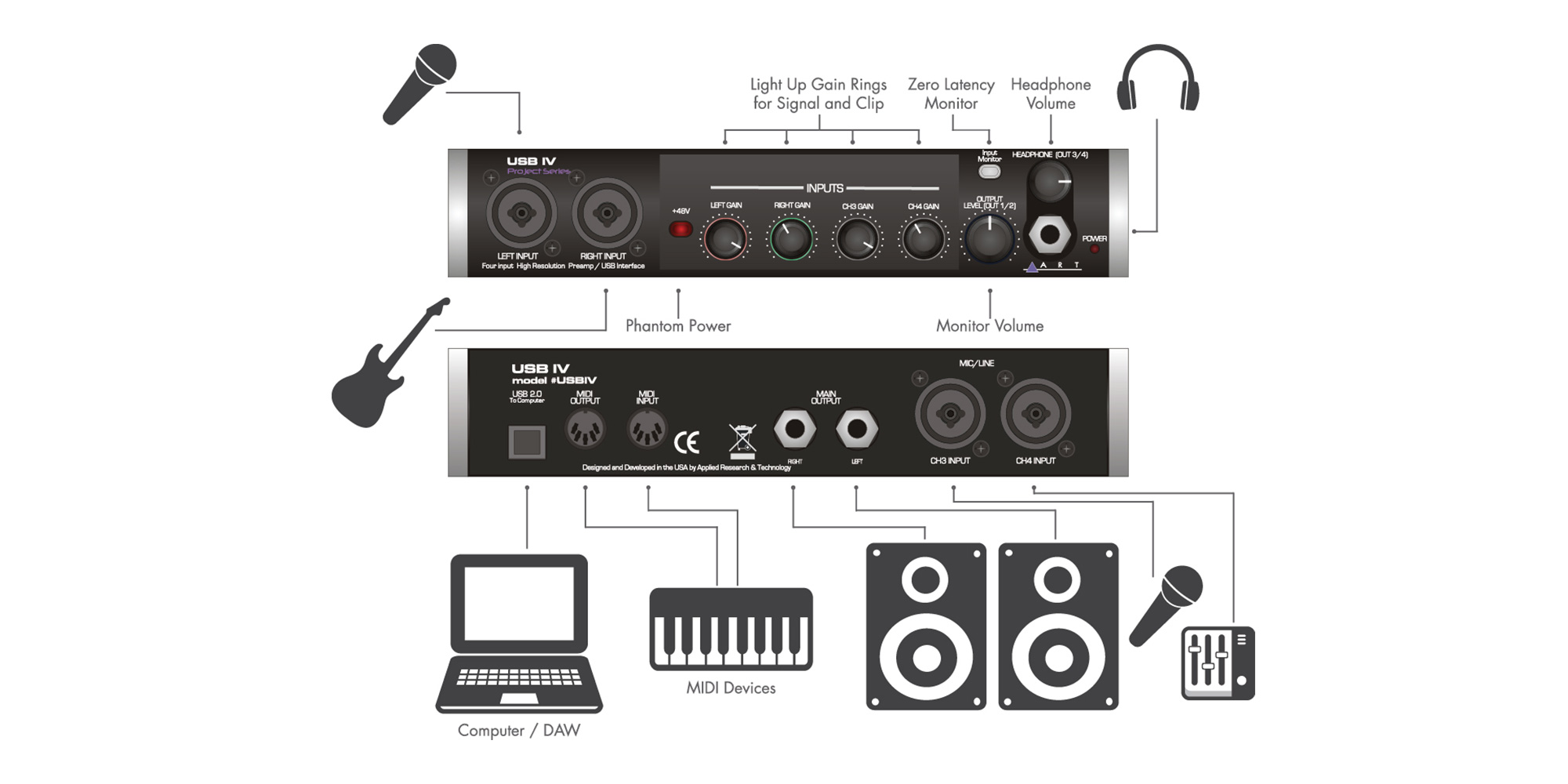 L'USB IV prende segnali a livello di strumento o di microfono e li converte con un ADC a 32 bit con frequenze di campionamento da 44,1kHz a 192kHz per l'ingresso del computer. L'audio USB viene convertito utilizzando un DAC stereo a 32 bit in audio analogico. I trasformatori personalizzati rimuovono i loop di massa e altri disturbi del sistema tra il rumore digitale e quello analogico tra il sistema audio digitale e quello analogico